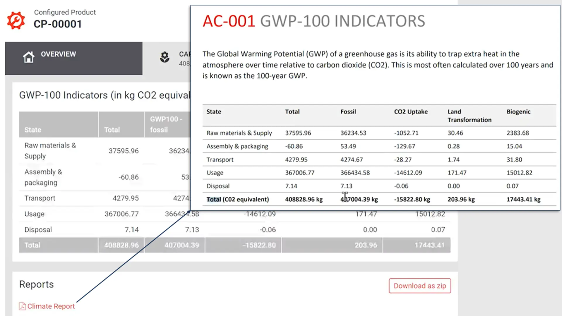 Die Daten basieren auf den Lebenszyklusanalysen (LCA) Ihres Unternehmens oder auf standardisierten Emissionsfaktoren. Diese Umweltkennzahlen werden mit den spezifischen Bauteilen, Materialien und Produktionsschritten im CPQ-System verknüpft.